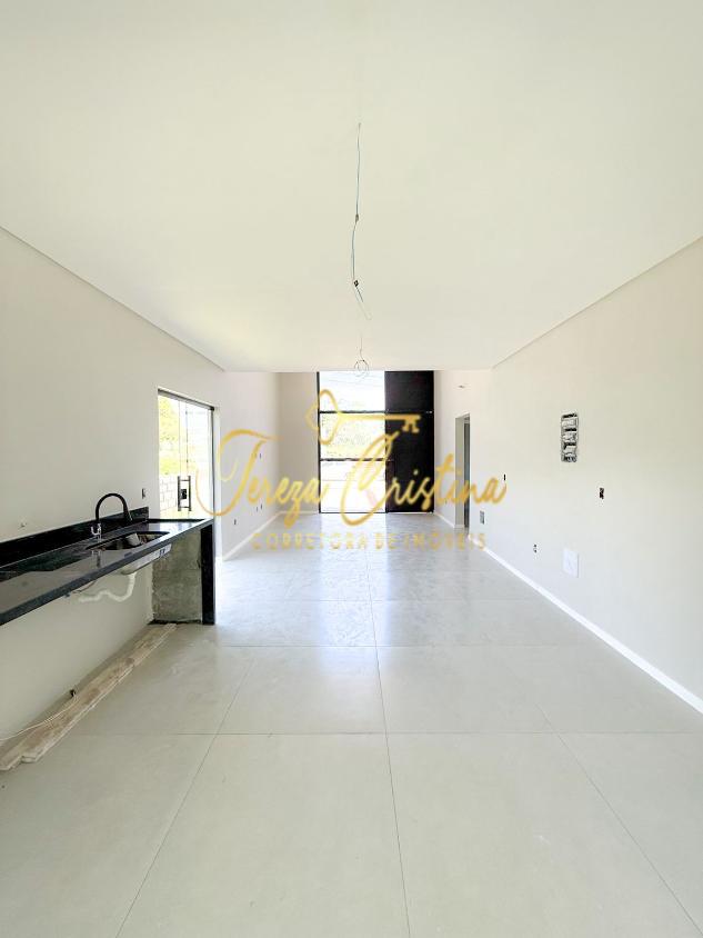 O imóvel possui pé-direito duplo, porcelanato em todos os ambientes e laje completa, permitindo a construção de um segundo pavimento se desejado. A planta é extremamente funcional e elegante: